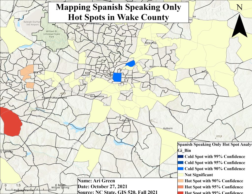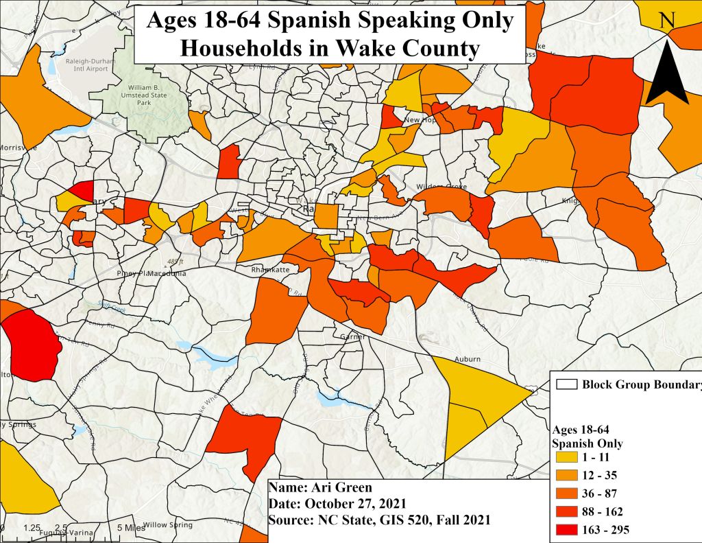 As a consulting GIS analyst, I have been hired by North Carolina’s Office of State Human Resources to develop a series of thematic maps and visualize possible spatial patterns in Census data for Wake County. In collaboration with my partner Ian Grace, we have been tasked with identifying spatial patterns in Census data concerning “age by language spoken at home by ability to speak English for the population 5 years and over.” As Wake County’s Latinx population continues to grow, State Human Resources has asked that we locate areas within Wake County that speak Spanish only.