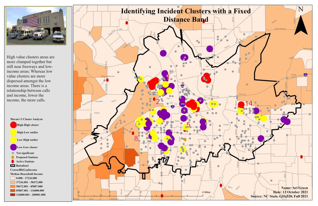 To further demonstrate mastery in using statistical tools, I used ArcGIS Pro and two different analysis tools – local and global. The primary input data used for this assignment came in form of maps that were already developed to complete the tutorials (to teach) and exercises (to use as fresh data on my own), both were centered around service/incident calls data. This data included census data, Dallas County boundary, and City of Ft. Worth data. Geographic data can be analyzed by describing and displaying the relationship between other data. Spatial statistics allows me to measure the intensity of the clustering as well as identifying values that are the same – together. First, I used the Cluster and Outlier Analysis tool to create a feature class that would display the level of clustering and determine the type of clustering (high and low values and outliers). To minimize the number of outliers and errors, I ran the Cluster and Outlier Analysis tool again with a distance band of 900 feet. Secondly, I performed a hot spot analysis by using the Getis-Ord Gi tool to identify the clusters of residents who have a high-income versus low-income and in what areas these clusters are in.