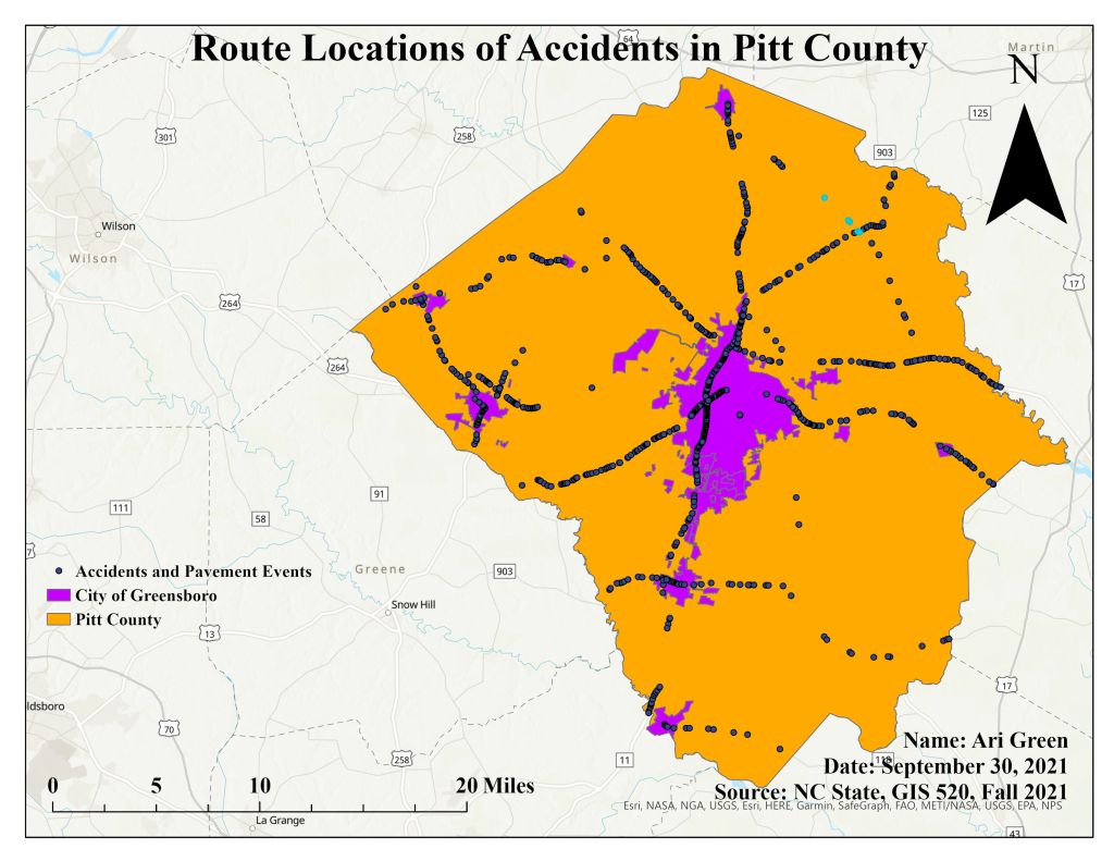 To analyze the number of accidents and the types of roads in Pitt County, I used ArcGIS Pro and customized a Linear Referencing ribbon that would allow me to use tools such as Make Route Event Layer, Identify Route Locations, and Overlay Route Events. The primary input data for this assignment came in the form of a geodatabase (.gdb), which included a city boundary, county boundary, and two standalone tables with accidents data and pavements data. Geographic data can be stored using the method of linear referencing. First, I chose a proper color scheme to display my city, county, and some_routes layer. Then I used the select by attribute tool and created the expression route1 = 30000030. On this highlighted route, I used to the Identify Route Location tool within the Linear Referencing Ribbon to determine that minimum and maximum values of measures on the route. This tool also helped calculate how many road segments in the route. This assignment called for the use of the Select by Attribute tool multiple times to determine the number of accidents in Route 30000030, the number of segments that have a rating greater than and less than 75, and to calculate total miles of certain segments. The Make Route Event Layer tool was also utilized to be able to display accidents along a route and display roads. And lastly, the Overlay Route Event tool was used to intersect the accidents table and the pavements2 table and display the geospatial data.